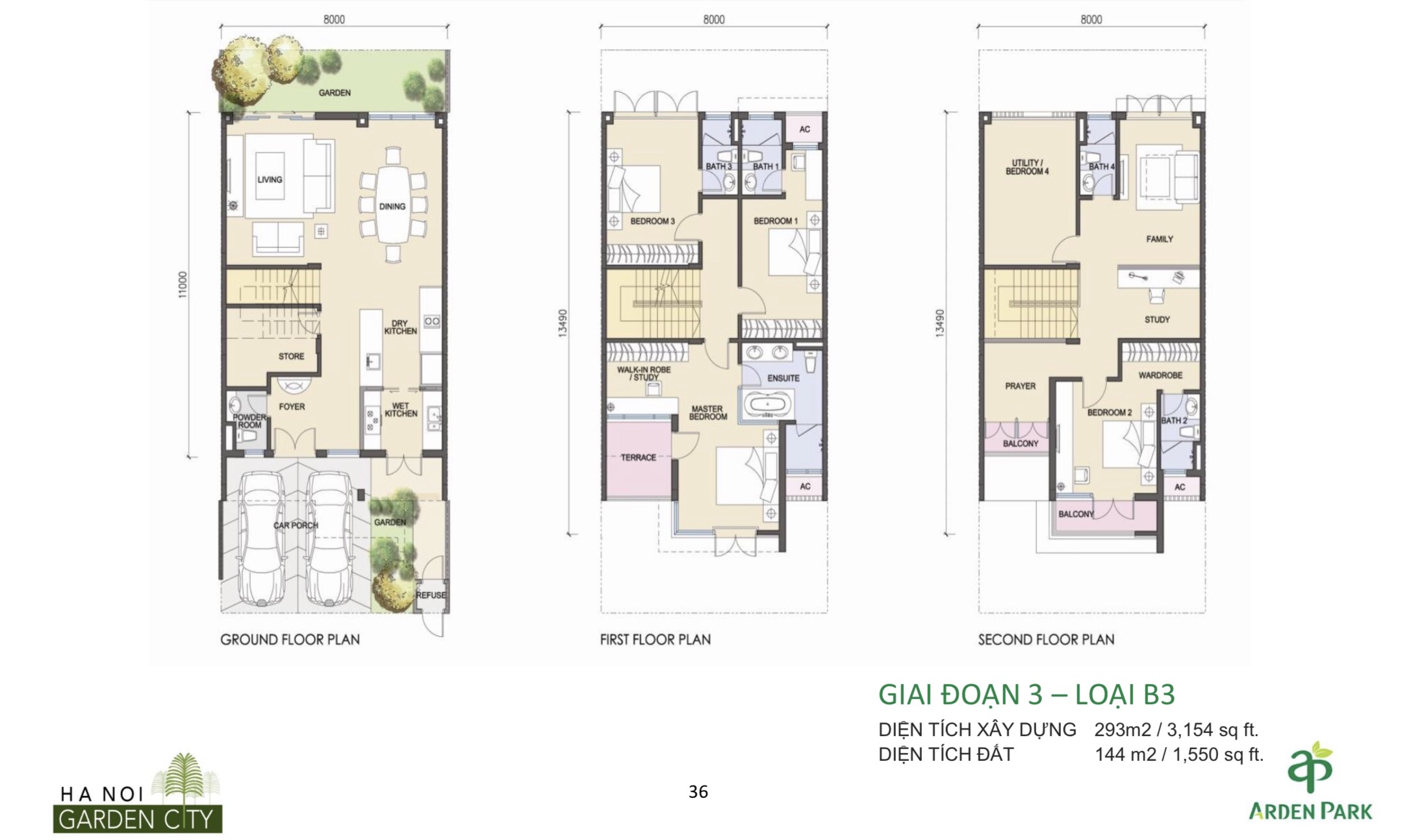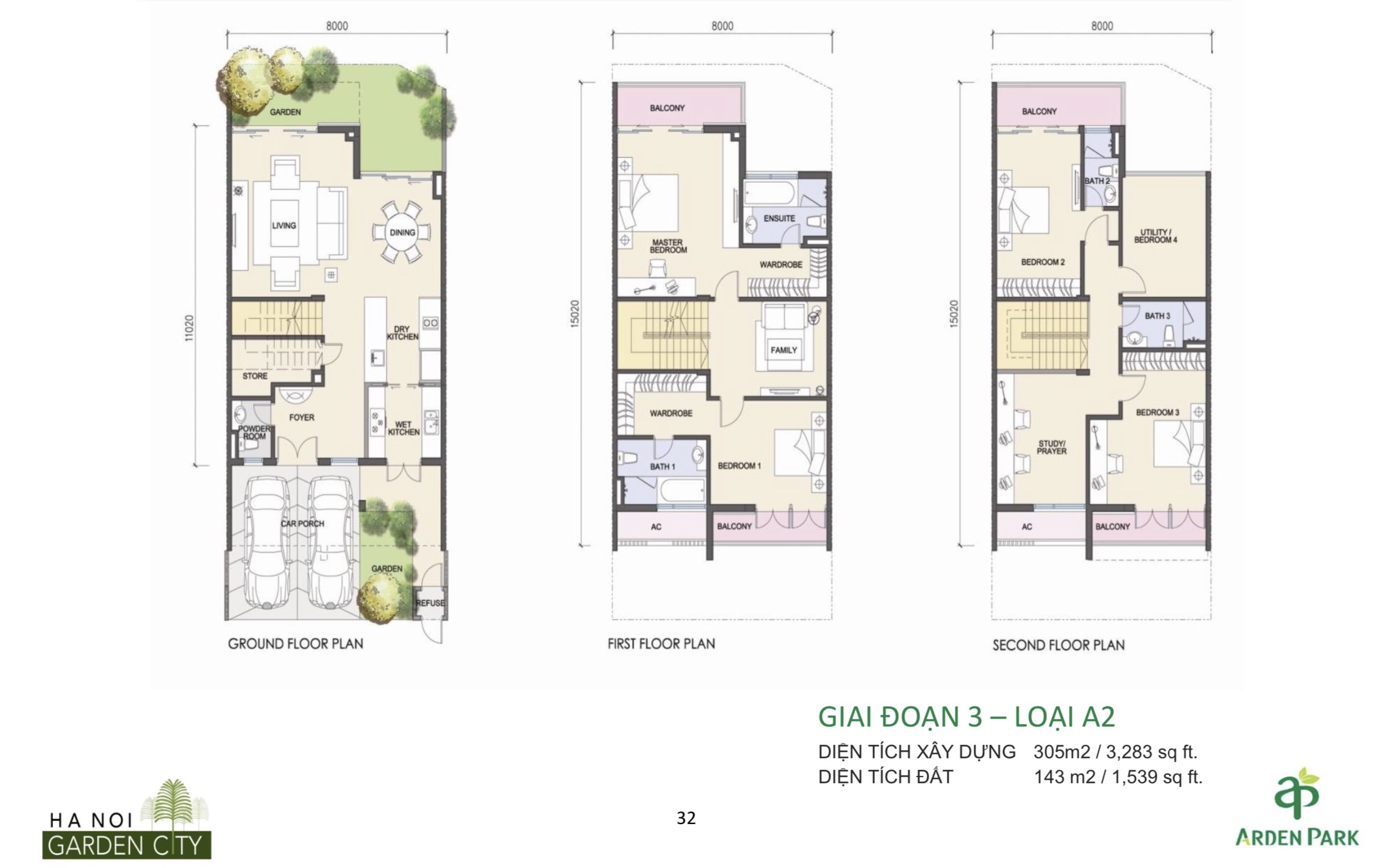 Các lô biệt thự Arden Park đều có mặt tiền 8m kéo sâu 18m. Lô 144m2 loại A và B đều được thiết kế với 2 chỗ để oto trước cửa, phía sau nhà đều có một khoảng sân vườn nhỏ 15m2 để gia chủ có thể trồng các loại cây mà mình yêu thích hoặc bài trí bàn trà.